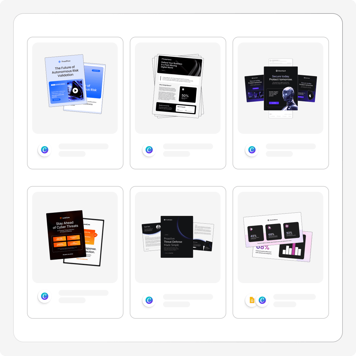 A constantly growing collection of cyber-specific templates—created by designers who understand the industry, the visuals, and the workflows. From social banners to reports, diagrams, pitch decks, product visuals, and full campaign kits… your team finally has every asset type covered.